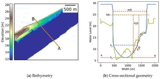 To validate the cross-sectional geometry (Section 3.3) with in situ bathymetry, we apply two offsets, and to the long-term water level time series to get an individual time series for each cross-section :