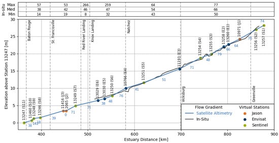 Flow Gradient [] of the Lower Mississippi River (blue numbers) derived from adjusted virtual station elevations. A longitudinal profile derived from bathymetric survey data is shown in black. The dashed lines represent the locations of in situ water level gauges. The minimum, median, and maximum flow gradient between the gauges is shown at the top.
