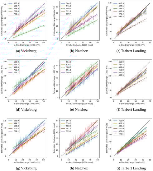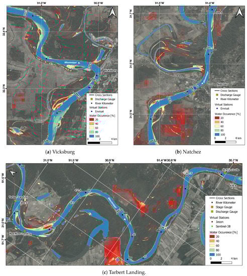 The methodology presented in this paper can be applied at any location along the river since the input data is not bound to a specific location. However, it may not be suited for every river segment. For example, it can be expected that the estimated river bed elevation and thus the channel geometry is incorrect in curved river segments, because of strong erosion along the thalweg []. For this study, we focus on the three in situ discharge gauge locations within the study area at Vicksburg, Natchez, and Tarbert Landing. For each study area, we examine a CS at the gauge and four to five additional nearby locations. Using the DAHITI water occurrence mask, the additional CSs are selected to be situated in reaches with geomorphologic features such as straight and wide river segments without irregularities such as sand banks or multiple channels. Therefore, the additional CSs are expected to be most suitable for the application of the methodology. Each CS is numbered according to the respective estuary distance in kilometers. Figure 7 shows a map for each study area with each gauge, VS, and CS. Additionally, the figure shows the DAHITI water occurrence masks.