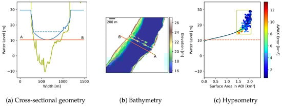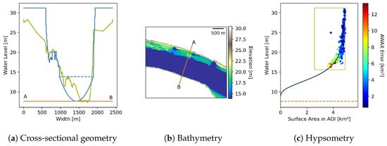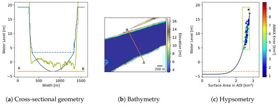 The bathymetry is constructed using the method by Schwatke et al. [] whose details and adaption to rivers are described in the following paragraphs. It combines water levels from satellite altimetry and land-water masks to estimate the bathymetry and volume variations of lakes and reservoirs. The two datasets are combined by fitting a hypsometry, which considers the water level as a monotonically increasing function of surface area. To adapt this method to the application on rivers, we clip the land-water masks to the AOI and remove non-contiguous water surfaces using image segmentation methods which ensures that the area-height relationship is monotonically increasing within the AOI.