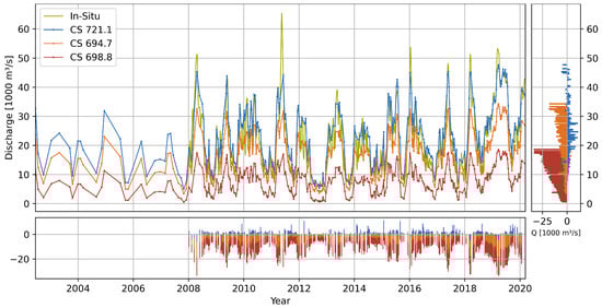 In situ discharge is usually calculated using the water level measured at a gauge and a functional relation (rating curve), which is calibrated and regularly adjusted by in situ velocity measurements and depth soundings [,]. Establishing and maintaining such a discharge station is an involved and complicated process, which is cost- and time-intensive []. Thus, despite the need for increased attention to the global water cycle and freshwater resources, the number of freely available in situ discharge time-series in public databases such as the Global Runoff Data Centre (GRDC) is rapidly declining since about 1980, especially in remote areas outside Europe or the USA []. Therefore, there is a strong motivation to estimate discharge with remote sensing techniques.