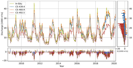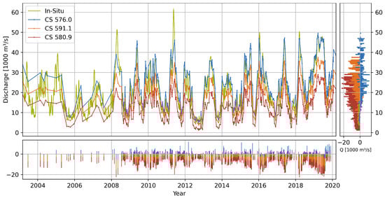 where is the median of the differences between the long-term satellite altimetry time series and the time series of a nearby water level gauge g, and is the height difference between the cross-section and that gauge. To obtain , we determine the gauge elevations analogous to the virtual stations using Equations (4)–(6) and estimate the elevation at the position of the cross-section using a linear interpolation between the gauge elevations. is the difference between the interpolated elevation and the elevation of gauge g.