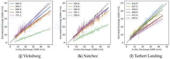In contrast to Vicksburg and Tarbert Landing, the time resolution of the in situ discharge time series for Natchez provided by the USACE is not daily but contains a record every 14 days on average with 585 entries in the time period from 3 January 2000 to 10 September 2019. However, only 21 in situ observations match a date in the estimated discharge time series and can be used for the validation. In order to increase the number of validation data, an additional discharge time series is estimated using a rating curve based on daily water level measurements at Natchez, which are also provided by the USACE. To consider the hysteresis effect [], we use the rating curve formula by Jones [,,]: