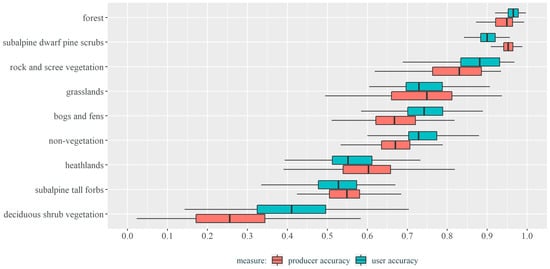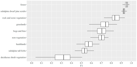 The best-classified types of vegetation turned out to be forest and subalpine dwarf pine scrubs. Both classes reached a median of PA, UA, and F1 accuracies of around 90%—i.e., 94%, 89% (Figure 4), and 90% (Figure 5), respectively. Due to the high internal homogeneity, these classes also represent the greatest stability, which is confirmed by the small width of the distribution of achieved accuracy. Satisfactory results, above 60% of both accuracies and an F1 score above 70%, were also obtained for classes whose spectral characteristics constituted a specific mixture of signals, i.e., rock and scree vegetation and those characterized by unique physiognomy during subsequent stages of the growing season, i.e., grasslands. Deciduous shrubs were the worst classified type of vegetation, for which the median for both accuracies was less than 50% and F1 did not exceed 60%. For some classes, PA was lower than UA, because it was more difficult to fit the result with the validation data, e.g., for openwork and heterogeneous deciduous shrub vegetation class. For homogeneous classes like subalpine dwarf pine scrubs, this fit was simpler, and PA exceeded that of UA.