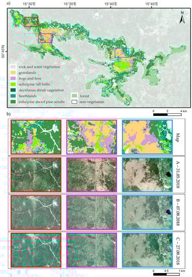 Map of vegetation types of the Giant Mountains; basemap: Sentinel-2 image in natural red, green, blue (RGB) composition, acquired on 31 May 2018 (a); enlarged parts of the map and Sentinel-2 images in natural red, green, blue (RGB) compositions that make up the ABC dataset (b).