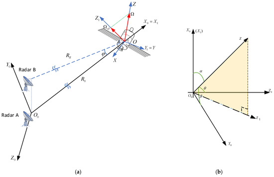 where is the azimuth angle between radar A and radar B; is the azimuth angle of radar A. Because the plane is made of and , the -axis can be expressed as