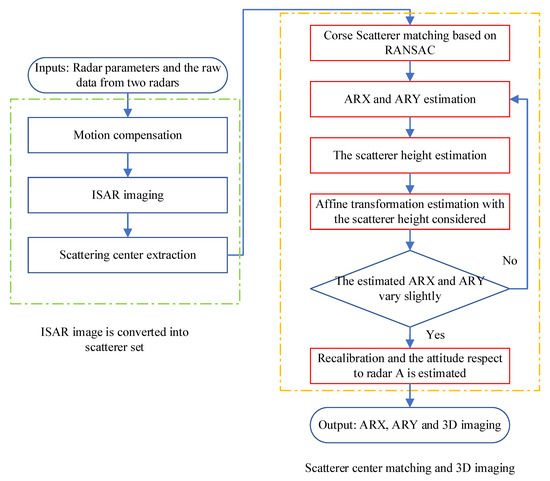 The process in the yellow rectangle was used to match scattering point sets and 3D imaging. First, the height of each scatterer was set as one. Meanwhile, a coarse scatterer matching in RANSAC was carried out. Based on the preliminary transformation, one could estimate ARX and ARY. Then, the scatterer height was obtained based on the preliminary ARX and ARY. After scatterer height estimation, affine transformation with estimated scatterer height was performed. The estimation of ARX, ARY, and scatterer height was executed iteratively. The iteration was stopped when the estimation of ARX and ARY varied slightly. Finally, an accurate ARX and ARY was derived from a small range of searching. The operations in the red rectangle will be described in detail in the rest of this section.