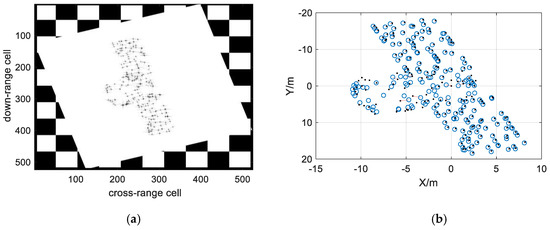 The proposed method is shown in Figure 2. After receiving the target echoes from two arbitrary radars, motion compensation was accomplished first. Then, through scattering point extraction, the ISAR image was converted into a scatterer set.