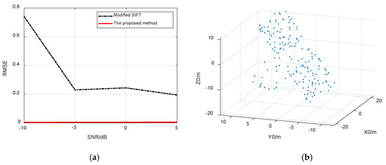 where is the estimated , and is the real value. Using different signal-to-noise ratio (SNR) , 200 Monte Carlo experiments were carried out. The RMSE of the estimated is shown in Figure 6a. The performance of the modified SIFT was better as the SNR improved. The proposed method was not affected by the noise in this range. This is because the dominant scatterer extraction algorithm is highly precise. A precise dominant scatterer extraction is the foundation of the proposed method. After feature points matching, the target 3D image can be obtained, as shown in Figure 6b. A comparison of estimated target attitude and the setting target attitude to radar A is shown in Figure 7.