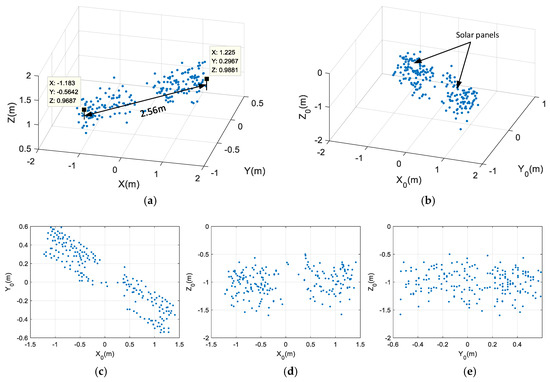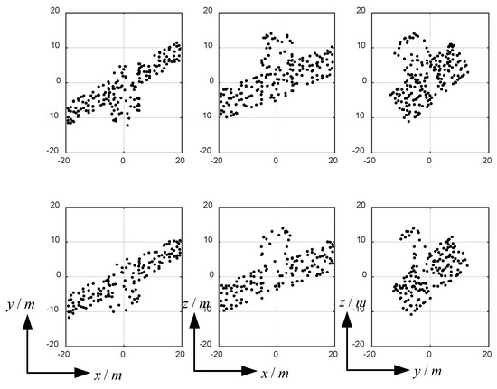 Through scattering center extraction, the extracted SPA and SPB are shown in Figure 10. Figure 10b shows eight edge points with strong sidelobes. Due to the difference in the angle of incidence and the degree of position occlusion at the edge points, its scattering intensity also changed, two of which were significantly larger than the other six. There were also scattering points between the eight edges. After RANSAC, the converted SPA and SPB are plotted in Figure 11b. Since the influence of noise on RANSAC is relatively small, the influence of sidelobes in SPB can be removed after preliminary scattering point matching. After iteration, the target 3D image can be obtained, as shown in Figure 12a. The estimated length of the solar panel was 2.56m. The estimated ARX and ARY are listed in Table 3. According to the estimated ARX and ARY, the 3D reconstruction with respect to the radar coordinate system is shown in Figure 12b, where two solar panels are identified. The three views of Figure 12b are shown in Figure 12c–e. Compared with SPA in Figure 11a, the front view of Figure 12c is bigger and upside down. According to (50) and (51), the top view shows and in the radar coordinate system. Figure 11a shows and , which is the projection of target to the image plane. This image plane is different from the plane.