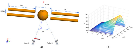 where is the third element of . is influenced by and , and the relationship is shown in Figure 8b. Because the pitch angle of two radars is the same, is greater than 90° and less than 115°. In addition, cannot be obtained from the preset parameters. The CADFEKO model is abstractly represented in Figure 9a. For the convenience of analysis, the red part of Figure 9a is shown in Figure 9b. can be obtained by