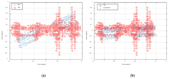 where , denotes the corresponding radar residual phase, and and denote scattering location in the corresponding image . For a short observation time, can be approximated as 1, and can be approximated as . After scattering point extraction, two scattering point sets can be achieved: scattering point set A with scatterers and scattering point set B with scatterers. For the convenience of expression, and are defined as SPA and SPB, respectively. According to (16) to (22), SPA can be expressed as