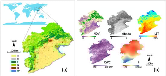 Study area of the Haihe River Basin and the land use and cover pattern. On the legend: A=agricultural land, B = bare land, F = forest, G = grassland and shrub, U = urban, W = waters and wetland (a). The spatial patterns of the selected land surface and regional climate indicators (NDVI = normalized difference vegetation index, LST = land surface temperature, CWC = cloud water content, P = precipitation) (b).