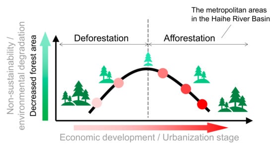 Conceptual diagram illustrating how urbanization drives regional forest increase by afforestation after a certain stage of economic development (indicated by the vertical dashed line) under the framework of the Environmental Kuznets Curve (adapted from [35]).