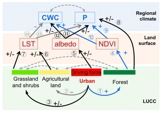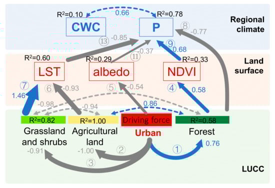 Between the second and third layers, we constructed all potential links to quantify the interaction between land surface indicators (NDVI, albedo, and LST) and regional climate indicators (P and CWC). Among these links, we assumed that NDVI had the positive effects on P and CWC (pathway ⑨ and ⑩: +) because the evapotranspiration of vegetation promotes the regional hydrological cycle [27,44]. In contrast, we assumed that LST had the negative effects on P and CWC (pathway ⑬ and ⑭: −) by heating land surface and drying air water [15,39]. Moreover, because forest ecosystems play a vital role in the regional hydrological cycle [45,46], we added a direct link from forest area proportion to the regional P (pathway ⑧: +/−).