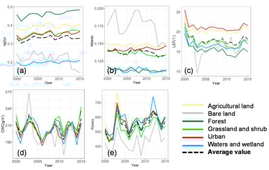 The annual average NDVI of the basin increased from 0.34 in 2001 to 0.38 in 2004, and had since fluctuated around the latter level (Figure 5). The annual average albedo exhibited an overall decreasing trend from 2000 to 2015. The annual average LST decreased in the first four years (i.e., from 2000 to 2003) and then got steady around the level of 17.4 °C since 2004. The CWC and P showed similar temporal dynamics, both peaking in 2003 and reflecting the accordance in the atmospheric hydrological cycle indicators. The trends of these five indicators in each land use and cover type are summarized in Table 2. The results showed that the natural vegetation, including forest and grassland/shrub, experienced significant trends in NDVI (increasing), albedo (decreasing), and LST (decreasing). The urban area showed a significant increase in both NDVI and albedo.