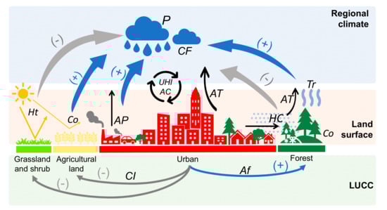 The conceptualized summary diagram of the three sub-systems to demonstrate key processes and effects enhanced in the land-climate dynamics under the land use and cover change (LUCC) driven by the urbanization in the Haihe River Basin. (The abbreviations of processes or effects: Cl = crop intensification, Af = afforestation, HC = horizontal condensation, Ht = land surface heating, Co = land surface cooling, AP = air pollution emission, UHI = urban heat island, AC = atmospheric convection, AT = atmospheric turbulence, Tr = transpiration, CF = cloud formation, P = precipitation, (+) = increasing, (−) = decreasing).