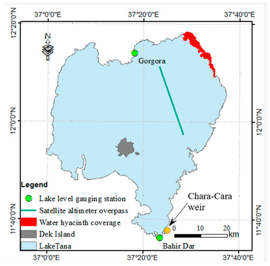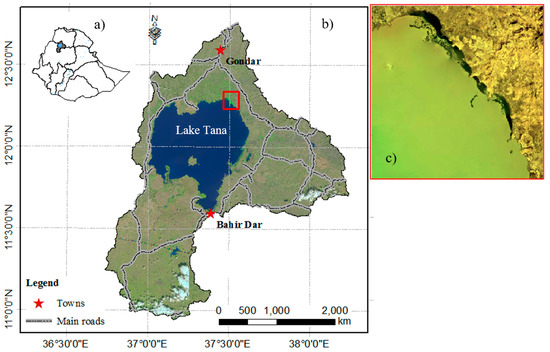 Lake Tana is the largest freshwater lake in Ethiopia, and it is the source of the Upper Blue Nile River. The Upper Blue Nile River contributes more than 50% of annual streamflow to the Nile River [24,25]. Lake Tana has a catchment area of 15,000 km2, out of which the lake covers 20%. The lake is located in the north-west highland of Ethiopia; its exact geographic coordinate extends between 10°45′54.1′′ N, 36°10′24.9′′ E and 12°50′15.9′′ N, 38°50′54.48′′ E (Figure 1).