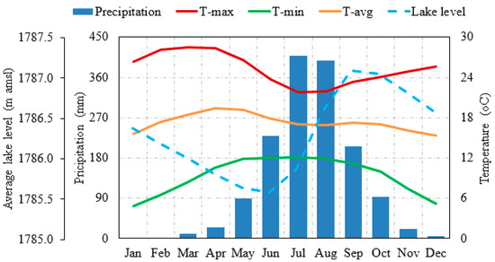 Average monthly rainfall (mm), minimum, and maximum temperature (°C) of Bahir Dar Station (1994–2016) and average monthly lake level (m; 1994–2010).