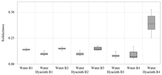 The visual inspection of the PlanetScope images showed a large infestation of aquatic weed in the northeast shore of Lake Tana. Figure 5 presents the reflectance of the water hyacinth and waterbody at 56 selected pixels on the satellite images across the study area over the selected satellite images (Table S1). The one-way analysis of variance (ANOVA) on the reflectance of the aquatic weed and waterbody indicated a significant difference in reflectance between band 1, 2, 3, and 4 (p < 0.05). The difference in the near-infrared wavelength (band 4) was very high since water has relatively lower reflectance while water hyacinth (green vegetation) has higher reflectance in this range. Therefore, a supervised classification was implemented by developing an image mosaic of bands 4, 3, and 2 to map the spatial extent of the water hyacinth.
