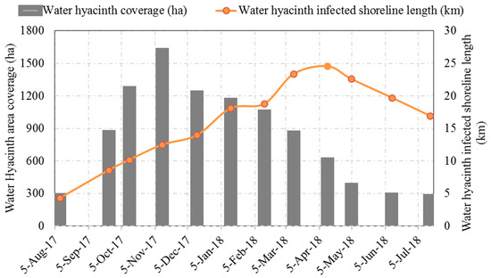 Figure 7 presents the spatial coverage of the water hyacinth of the selected images during the study period (Table S1). The water hyacinth was first observed in the northern shore of the lake (Figure 7a). A significant proportion of the weed moved to the northeast and expands to the eastern shore of Lake Tana (Figure 7a–e). According to the satellite images, for the period August to November 2017, the water hyacinth was expanding at a rate of 14 ha/day and covered 1600 ha of the lake. On the other hand, the coverage decreased at a rate of 6 ha/day from December 2017 to June 2018. The lowest water hyacinth coverage was observed in June 2018 at 300 ha. Despite the area reduction for the period August 2017 to July 2018, the length of water hyacinth infestation was increasing across the lake shoreline. The maximum infestation length was 23.8 km in April 2018 (Figure 6).