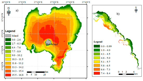 The average annual day and night-time water temperature for Lake Tana were estimated from the MODIS satellite image for the period 2010–2016 (Figure 9a,b). For this period, the annual average daytime water temperature ranged from 20.7 to 33.9 °C, averaging at 22 °C. The northern and central parts of the lake were cooler in the daytime (Figure 9a). The daytime temperature indicated higher spatial variability with a standard deviation of 1.9 °C compared to that of the night-time temperature, which had a standard deviation of 0.6 °C. The night-time temperature was warmer in the northeast shore of the lake where there is water hyacinth infestation (Figure 9b), and ranges between 14 and 19.9 °C, averaging at 18.4 °C. The northeastern side of the lake is also characterized by shallow depth with a gentle slope.