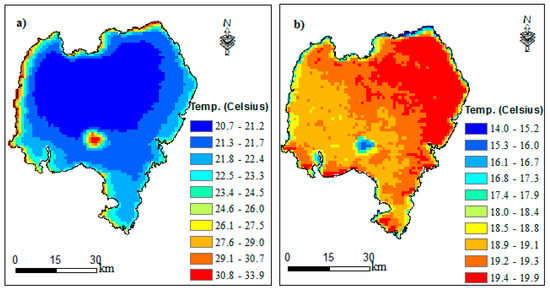 Average annual day and night-time water temperature for the period 2010–2016. (a) Daytime average annual water temperature and (b) night-time average annual water temperature.