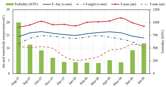 Minimum and maximum air temperature, day and night-time water temperature (primary y-axis), and turbidity in the proximity of water hyacinth infestation area (August 2017 to July 2018).