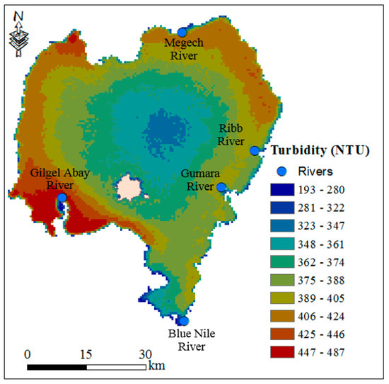Turbidity in Lake Tana is highly variable in both space and time. The average annual turbidity estimated for the period 2010–2016 is presented in Figure 11. The average annual turbidity of the lake was 348 nephelometric turbidity units (NTU) with a standard deviation of 30 NTU. Turbidity less than 25 NTU is relatively considered as clear and at 2000 NTU is completely opaque [73]. The highest turbidity was observed in the southwest shore of the lake near Gilgel Abay river mouth followed by the northeast part of the lake (Figure 11). The higher turbidity is due to sediment carried with the tributary rivers. For example, a Landsat image in December 1984 and December 2017 indicated that the river mouth delta at the entrance of Gilgel Abay to the Lake Tana increased from 12.7 to 21.8 km2 (an increase by 72%; see Supplementary Information, Figure S2). Likewise, the river entrance deltas for Gumara and Ribb rivers were also increasing, but at a lesser extent. Since Gumara and Ribb rivers drop the sediment at the Fogera floodplain, the sediment contribution of both rivers was relatively smaller [74,75]. The floodplains play a critical role by intercepting and trapping nutrient and sediment loadings that are transported with streamflow. Protection of the lake ecosystem should consider implementing best management practices along the watershed landscape and protecting the wetland.