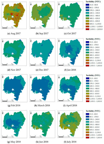 Spatial and temporal distribution of average monthly turbidity for the study period (August 2017 to July 2018).