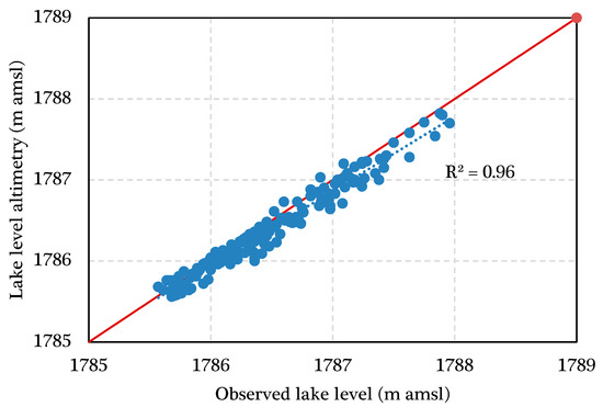 Comparison between ground-based and that of Jason-1 altimetry mission water level measurements before the construction of the Chara-Chara weir (i.e., 1993–1996) showed a very strong agreement (R-square of 0.96, p < 0.05, Figure 13) with a root mean square error of 15 cm. Jason-1 altimetry data has also captured well the observed lake level of several lakes of different size [50,76,77]. The altimetry data showed an annual average lake level fluctuation of 1.5 m for the period 1994–2010. This fluctuation was primarily driven by lake rainfall and streamflow during the major rainfall season. The lake level started rising in June, where rainfall started and reached a maximum level in September and declines linearly towards June of the following year (Figure 2). Given the Jason-1 altimetry data represented the lake level, and that it has data for the study period (August 2017 to July 2018), it was used to understand the relationship between lake level and water hyacinth spatial coverage dynamics.
