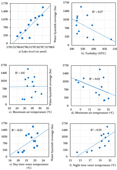 The environmental factors that plausibly contribute to the dynamics of the water hyacinth during the study period were compared with the spatial coverage of the water hyacinth (Figure 14). Among the factors studied, water hyacinth spatial dynamics showed a strong association with the lake level and night-time water temperature (Figure 14a,f). The lake level and night-time temperature relationship to water hyacinth expansion are explained by an R-square of 0.75 and 0.59, respectively. The remaining studied factors showed a weak linear relationship with the spatial coverage of the weed dynamics (Figure 14b–e). Turbidity, however, indicated a strong correlation with the spatial coverage of the water hyacinth with a 2-month lag (R-square of 0.74).