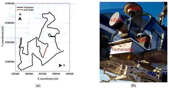 The study area is located at Evo in southern Finland (61°19′N, 25°11′E). The test site comprises three sections: east section, west section and south section, and investigational data in this paper are selected from one stripe in the west section (Figure 1a). It is a straight line trajectory when the helicopter can fly as horizontal as possible with minor turbulence to keep observing the boreal forest in the nadir direction steadily. Different from an entirely homogenous managed forest, this site is a popular recreation area and includes Scots pine, Norway spruce, and birch. Both Tomoradar and Velodyne VLP-16 lidar were mounted on an extended arm of a Bell 206 helicopter with a zero degree incidence angle (i.e., with the antenna pointing down as Figure 1b presents) at a flight height of 60–100 m. In addition, a Global Navigation Satellite System and an Inertial Measurement Unit (GNSS-IMU) were attached on the frame to supply the positions and attitude angles during flight campaigns of the helicopter. The Tomoradar and lidar measurements were time-tagged with GPS time and coincided in a centimeter-level manner. The suites of all instruments on the helicopter are presented in Figure 1b [10]. The field test was carried in the autumn of 2016 under partly cloudy conditions.