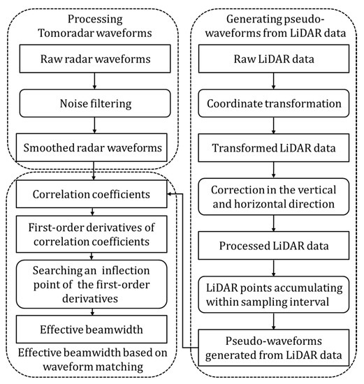 According to descriptions of raw Tomoradar waveforms and lidar data, the detailed schematic diagram of deriving the effective beamwidth of Ku-band profiling radar is presented in Figure 2. The methodology is employed by implementing three processing steps: (a) processing Tomoradar waveforms; (b) generating simulated-waveforms from lidar data; and (c) determining the effective beamwidth based on waveform matching method.