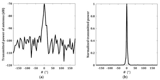 (a) The transmitted power of Tomoradar antenna in the unit of dB [28]; (b) the normalized transmitted power of Tomoradar antenna in Equation (3): . The zero point of corresponds to the axial center of microwave radiation, and the sign of is same as that of in Equation (4). The angular separation in the main lobe is close to 20°.