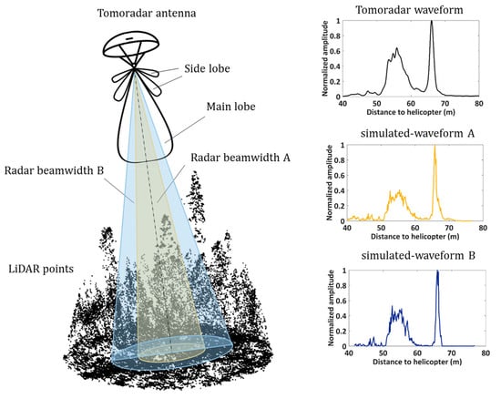 As the illustration shows in Figure 5, simulated-waveform A and B are generated from lidar points within radar beamwidth A and B, respectively. Better matching for the simulated-waveform B with Tomoradar waveform suggests that the radar beamwidth B is much more approximate to true Tomoradar beamwidth; that is, the effective beamwidth.