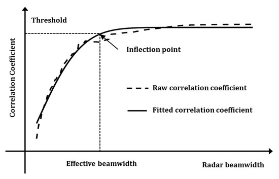 The schematic distributions of correlation coefficients versus radar beamwidth. The dashed line and solid line represent the raw and fitted correlation coefficients, respectively.