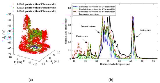 According to the above-mentioned methods, we processed the Tomoradar waveform and generated the simulated-waveforms within Tomoradar cone of 3°, 6°, and 9° for the 6700th Tomoradar measurement in the study area. The corresponding original lidar data and a graphical comparison between Tomoradar waveform and simulated-waveforms are shown in Figure 7.