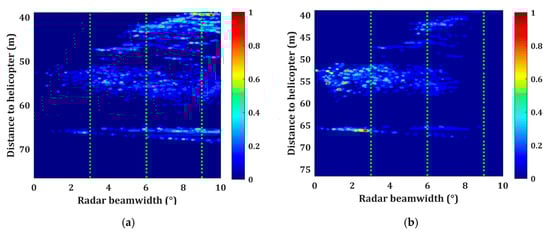 Hence, if both the gain of transmitting antenna and effective area of receiving antenna are given, two weight factors for each lidar point should be first introduced to derive the backscattered power for each lidar point in terms of Equation (3). One weight in the vertical direction is relevant with the distance , and the other weight in the horizontal direction is dependent on radar antenna pattern. They can be expressed by