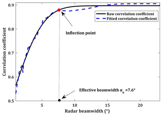 The distributions of correlation coefficients versus radar beamwidth for the 6700th measurement of Tomoradar. The inflection point is identified at a radar beamwidth of 7.6°.
