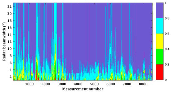 To quantitatively evaluate the similarity between Tomoradar waveforms and simulated-waveforms and find out the effective beamwidth for the 6700th Tomoradar measurement, the correlation coefficients were thoroughly computed for different radar beamwidths and presented in Figure 9.