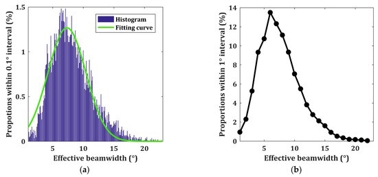In Figure 12a, we find a clear normal distribution from the proportions’ histogram with a maximal amplitude of 1.27%, and a peak location of 7.3° and a sigma width of 3.1°. If we change the interval of each section from 0.1° to 1°, then we could acquire the corresponding percentage within every section, as shown in Figure 12b, again, close to normal distribution. The effective beamwidth confined within the windows of (6° and 7°) holds a maximal fraction of 13.5%. Furthermore, 96.43% of the effective beamwidths take values from 3° to 20°, 3.25% of the effective beamwidths are less than 3°, and 0.32% of the effective beamwidths are greater than 20°.