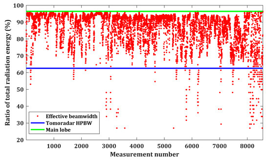 According to the distribution of the effective beamwidth in Figure 11 and Tomoradar antenna pattern in Figure 4, we compute the ratios of radiation energy to total radiation energy within the effective beamwidths as illustrated in Figure 13.