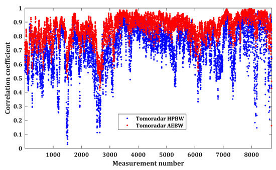 Observed from Figure 14, the correlation coefficients for Tomoradar AEBW are normally more significant than those for Tomoradar HPBW. About 78.84% of Tomoradar waveforms and simulated-waveforms generated within Tomoradar AEBW have very strong correlation strength. The fraction is much more than that for Tomoradar HPBW described in Table 1. It suggests that Tomoradar waveforms correlate very well with those simulated-waveforms if Tomoradar cone equals to Tomoradar AEBW rather than Tomoradar HPBW.