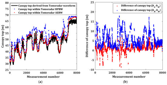 (a) The canopy tops extracted from Tomoradar waveforms and lidar data within Tomoradar HPBW and AEBW; (b) the differences of the canopy tops. The canopy tops derived from Tomoradar waveforms and lidar data within the Tomoradar HPBW and AEBW are symbolized with , , and , respectively.
