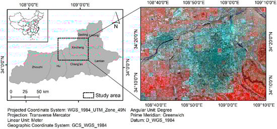 As the administrative, economic, and cultural center of Shaanxi Province, Xi’an has been one of the fastest urbanizing cities in China. In particular, the China Western Development national strategy has greatly promoted its economic growth since 2000. The rapid urban growth in Xi’an caused a decrease in forest areas, an increase in air pollution, and a degradation of environmental quality [41]. To investigate the spatial and temporal variation of thermal environment in metropolitan areas, the six municipal districts of Xi’an were selected as our study area, including Weiyang, Baqiao, Lianhu, Xincheng, Beilin, Yanta, and their surrounding areas (Figure 1).