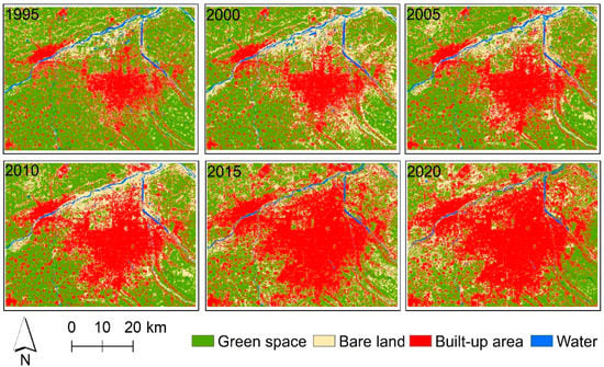 Land cover classification map in the study area for six time periods from 1995 to 2020.