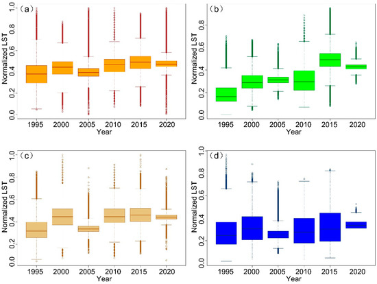 The association between NLST and land cover types across the six periods is further analyzed (Table 5). Generally, built-up areas and bare land had higher average NLST than vegetation and water. The relatively high LSTs in built-up areas were mainly associated with its different thermal characteristics from other land cover types. The buildings and paved surfaces in urban areas tend to cause greater absorption of solar radiation, greater retention of infrared radiation, and delayed release of heat [16]. Heat and moisture released from human activity, energy consumption, and transportation also contribute to the changes of LST in urban areas [16]. The temporal evolution of surface temperature showed an increasing trend for all land cover types from 1995 to 2020.