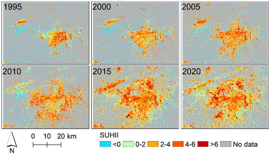 Spatial pattern of SUHII (°C) in the study area for six time periods from 1995 to 2020.