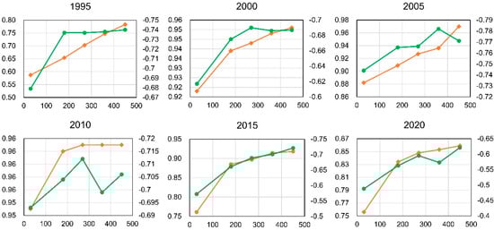 The areas and changes of each land cover type are shown in Table 4. An obvious increasing trend was observed for built-up areas, which increased from 413.74 in 1995 to 1022.75 km2 in 2020 in the study area. The area of green space and water bodies significantly decreased from 1995 to 2020. A total area of 616.42 km2 of vegetated area was converted into other land uses from 1995 to 2020. Green space mainly composed of agricultural lands in suburban areas was changed into construction land due to urbanization.